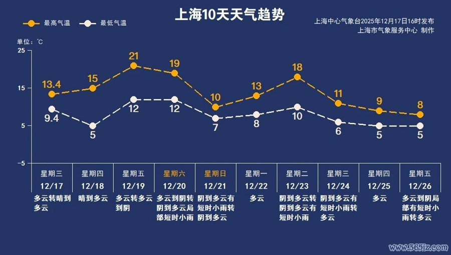 今天(12月17日)清晨辐照降温显豁,城郊温差悬殊:市区徐家汇站9.4℃,而金山最低仅2.0℃。白昼多云为主,午后阳光露脸,最高气温12~15℃(徐家汇站13.4℃),较昨日略降,空气依旧干燥。